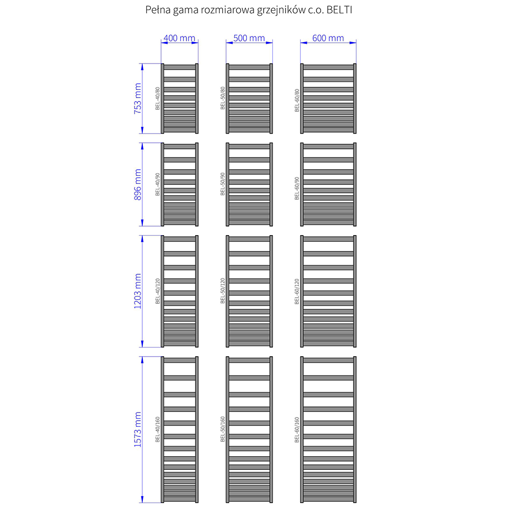 Wysokość [mm]: 896, Szerokość [mm]: 400, Kolor: grafit RAL7024 C12, Moc W dla temp. 75/65/20: 312, Typ grzejnika: BELTI, Rozstaw przyłącza [mm]: dolne 370mm,