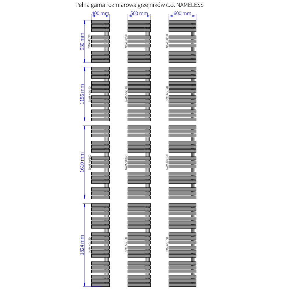 Wysokość: 1186, Szerokość: 400, Kolor: grafit RAL7024 C12, Moc: 380, Typ grzejnika: Nameless, Rozstaw przył.: dolne 50mm,