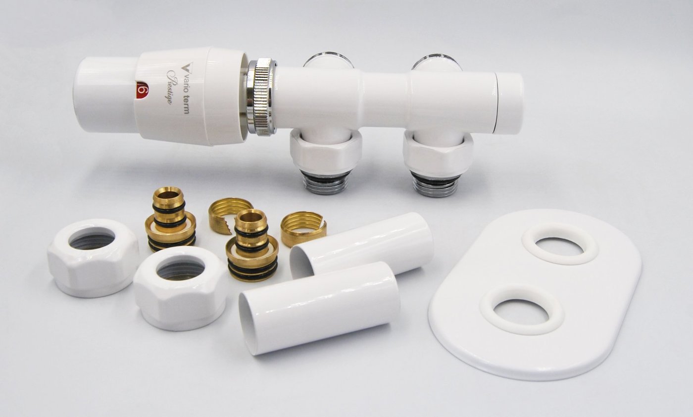 Ozdobny zestaw termostatyczny marki Vario Term do grzejników dekoracyjnych i łazienkowych z przyłączem dolnym w rozstawie 50mm i złączem 3/4 cala oraz adapterami połączeniowymi do rur PEX 16/2 od strony instalacji.