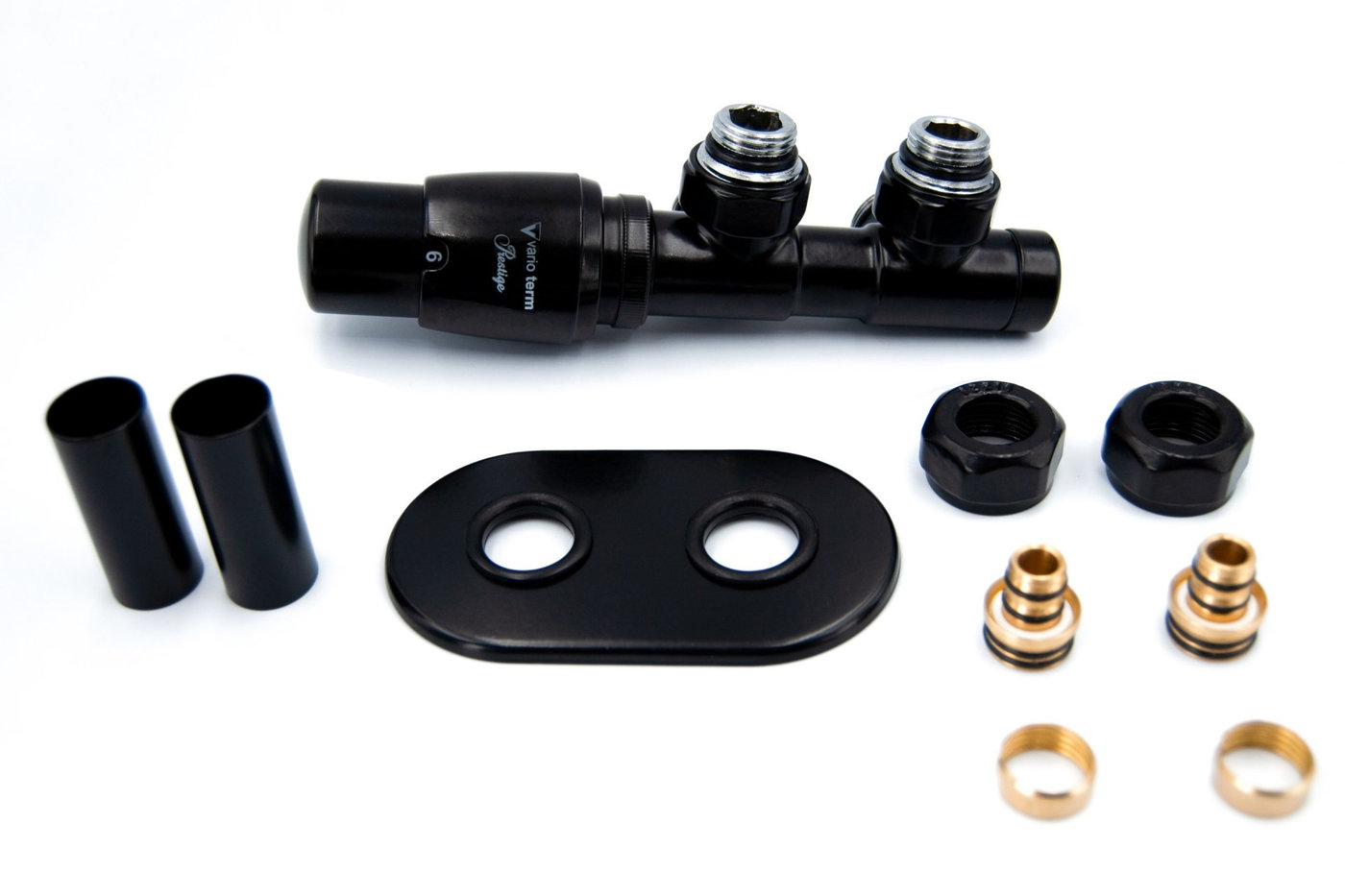 Ozdobny zestaw termostatyczny marki Vario Term do grzejników dekoracyjnych i łazienkowych z przyłączem dolnym w rozstawie 50mm i złączem 3/4 cala oraz adapterami połączeniowymi do rur PEX 16/2 od strony instalacji.